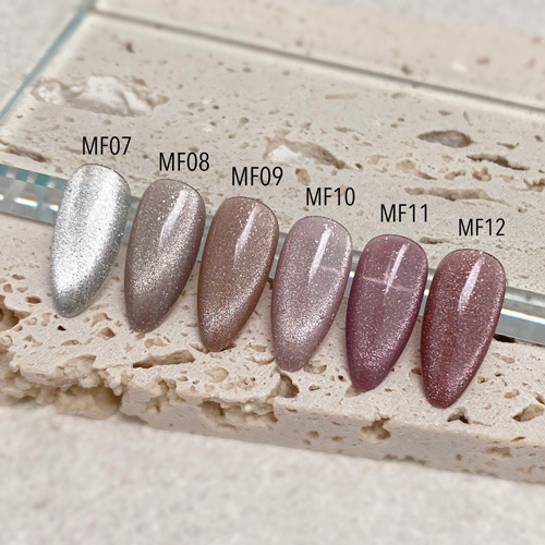 最強の艶と輝きを放つプラチナムフラッシュを使った新作、ダスティカラーシリーズはくすみ系カラーに透け感とほんのりマットな質感を加えながら、極上のギラギラ感はそのまま。