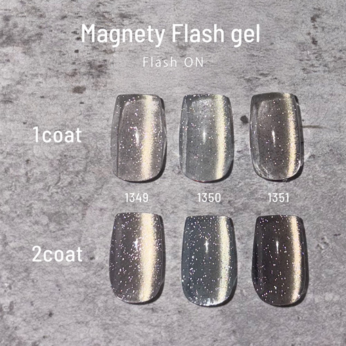 専用のマグネットを使用すると浮かび上がる光の筋と、光を反射するフラッシュグリッターが合わさり美しい輝きを放つ不思議なジェル。