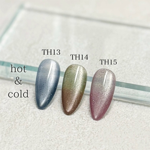 気温や体温によって色が変化する特殊なジェル。 サーモマグシリーズ。 今回は水光マグをプラス。 シルクのように繊細な艶とマグネットの輝きが、HOTな時もCOLDな時も24時間あなたを惹きつける表情に!