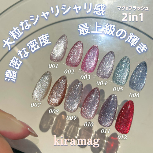 マグジェル きらマグシリーズ。 フラッシュ&マグの2in1ジェル! 大粒な粒子がかわいいきらマグ。 濃密な密度のざくざくグリッターの輝きは最上級。 マイビー きらマグの(001~012)の全12色セット。 ボトルタイプ 各8mL