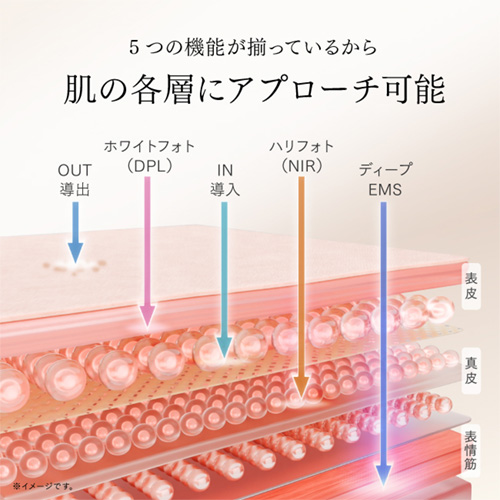 サロン級のフォト美容(ホワイトフォト/ハリフォト)による極上の「透明ハリ感*2」、EMSによる「リフトケア*3」、イオン導入導出による「うるおい」を叶えてくれます。