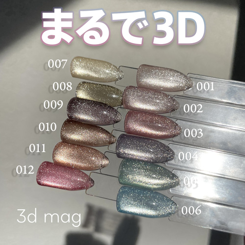 マグジェル 3dマグシリーズ。 まるで3D!!浮き出ているかのような立体感と強い輝きのマグジェル。 マイビー 3dマグの(001~012)の全12色セット。 ボトルタイプ 各8mL