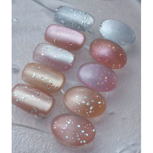 ヌーディなカラーにオーロラ感のあるホログラムを配合した001sdと002sdは季節問わず使用でき、カラフルなホログラムを配合した003sdと004sdは001sd、002sdと比較して少し粒子の大きいマグネットを配合しており華やかな爪先に仕上がります。