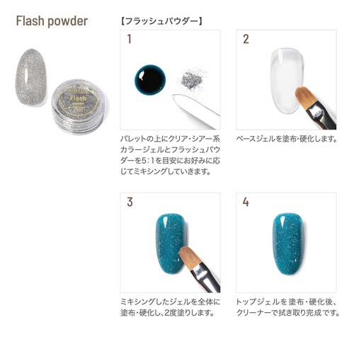 カラージェルに混ぜるだけで思いのままにオリジナルのフラッシュジェルが作れるパウダー。
