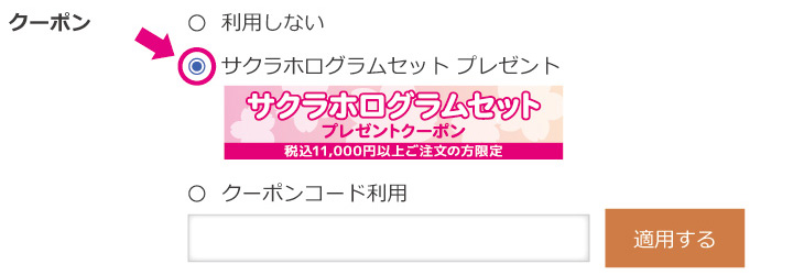 3. ご注文内容入力のページの「ポイント/クーポンのご利用」の欄で表示されたプレゼントクーポンの利用にチェック!