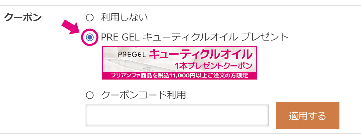 3. ご注文内容入力のページの「ポイント/クーポンのご利用」の欄で表示されたプレゼントクーポンの利用にチェック!